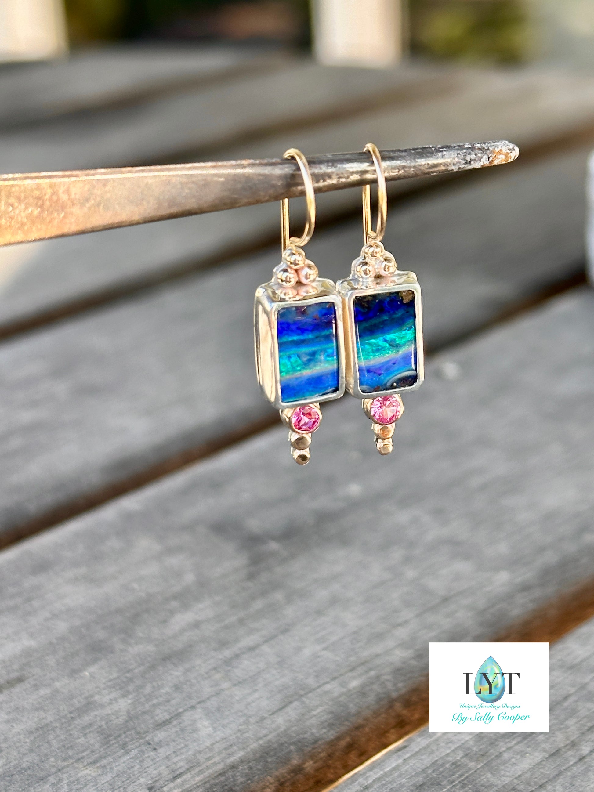 Gorgeous ribbons of sea blue and green Boulder Opals set in fine silver with 9 k accents. Also two very pretty pink synthetic Sapphires. Light weight and very very cute even if they're just on their own.