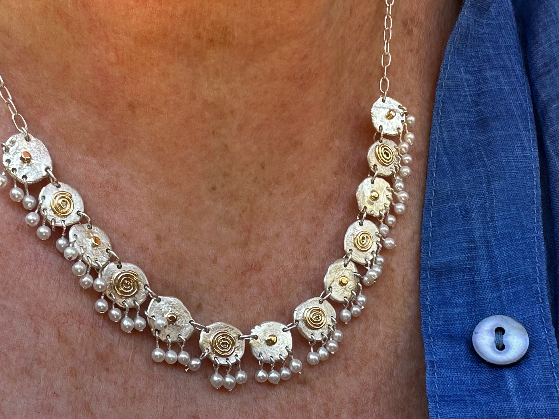 Baby fresh water seed pearls dance gaily from organic shaped sterling silver pebbles with 9k gold motifs.