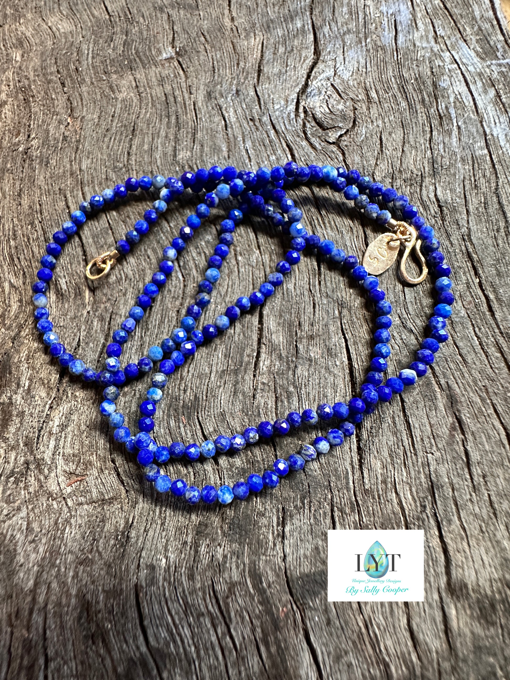 The Lapis necklace is 16 inches composed of 2mm round faceted beads that catch the light like diamonds and a 14k gold hook clasp, so beautiful.